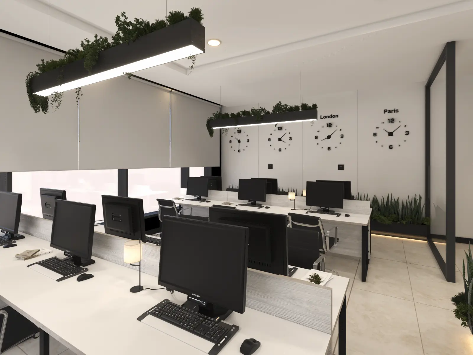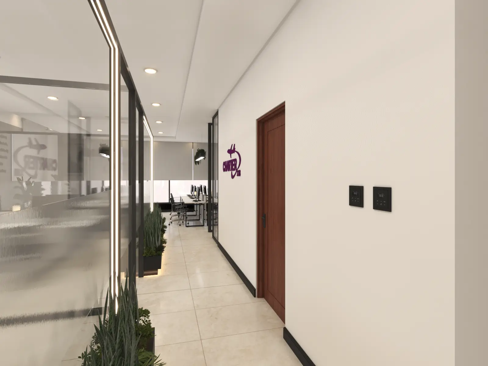 برای حفظ آرامش بصری و جلوگیری از شلوغی محیط، از رنگهای خنثی مانند خاکستری، سفید و بژ در ترکیب با بافتهای طبیعی استفاده شد. همچنین فضای سبز داخلی با گلدانهای خطی و گیاهان زینتی در بخشهای مختلف، حس طراوت و ارتباط با طبیعت را به محیط کاری اضافه کرد.
