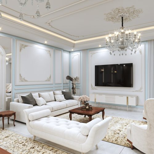 این پروژه با الهام از سبک کلاسیک، هماهنگ با نمای بیرونی ساختمان طراحی شده است. اصول طراحی داخلی بر پایهی تقارن، قاببندیهای ظریف و گچبریهای هنرمندانه شکل گرفته که در ترکیب با پالت رنگی آبی، فضایی فاخر و هماهنگ را ایجاد کرده است.