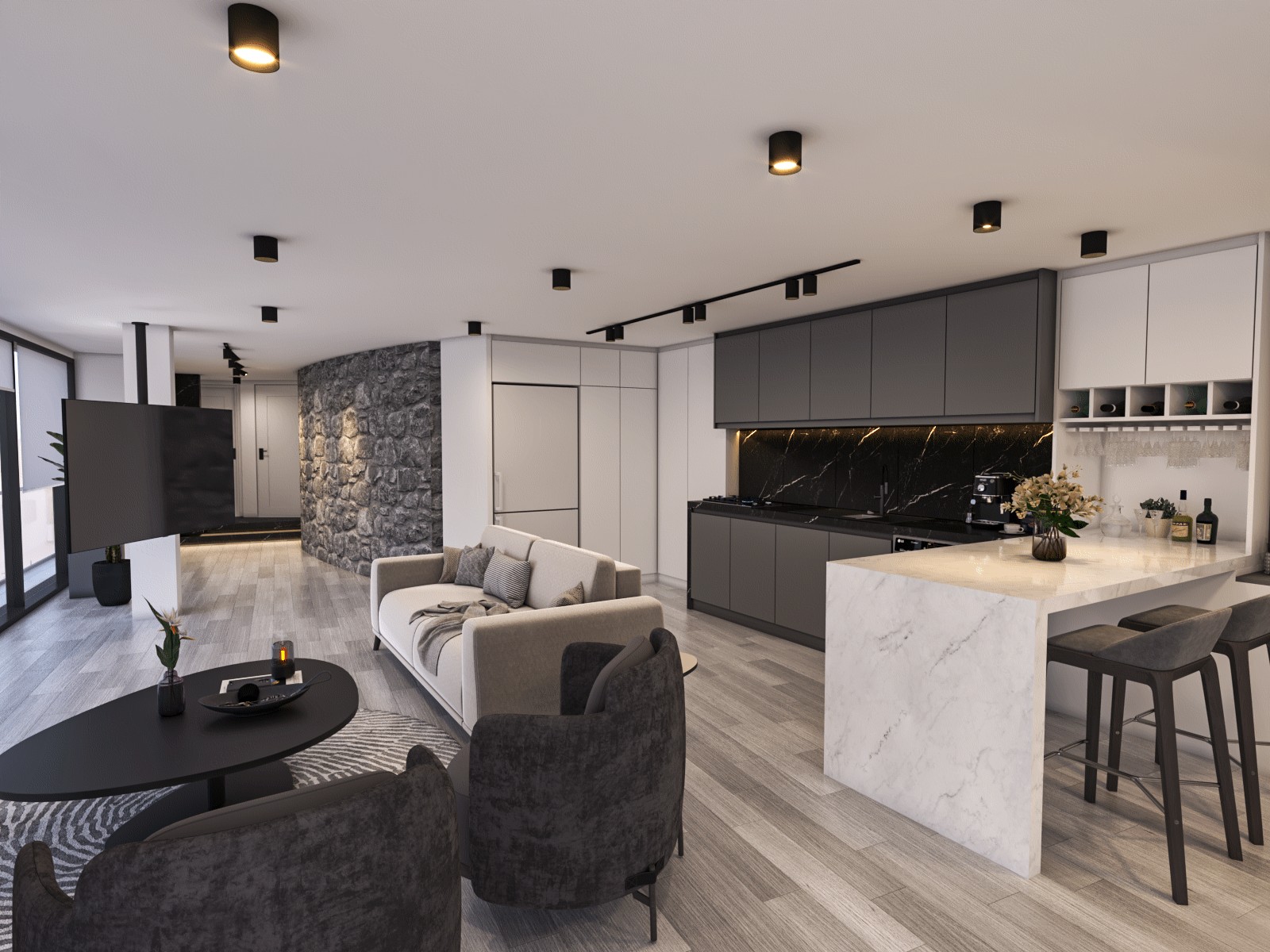 - طراحی تلویزیون معلق: برای حفظ بیشترین سطح مفید، تلویزیون بهصورت معلق در نظر گرفته شد تا هم فضا اشغال نشود و هم مسیر دید حفظ شود.