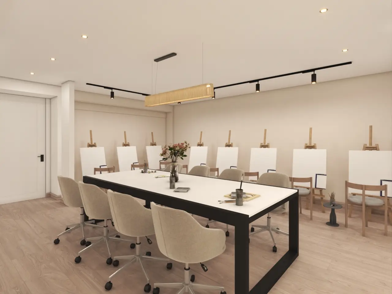 - فضای اموزشی جهت قرارگیری و استقرار پایههای بوم نقاشی برای حداقل ۱۲ نفر که دارای وسایل و ابزار شخصی هستند. که اهمیت طراحی جدارههای پیرامونی این بخش مهم است.